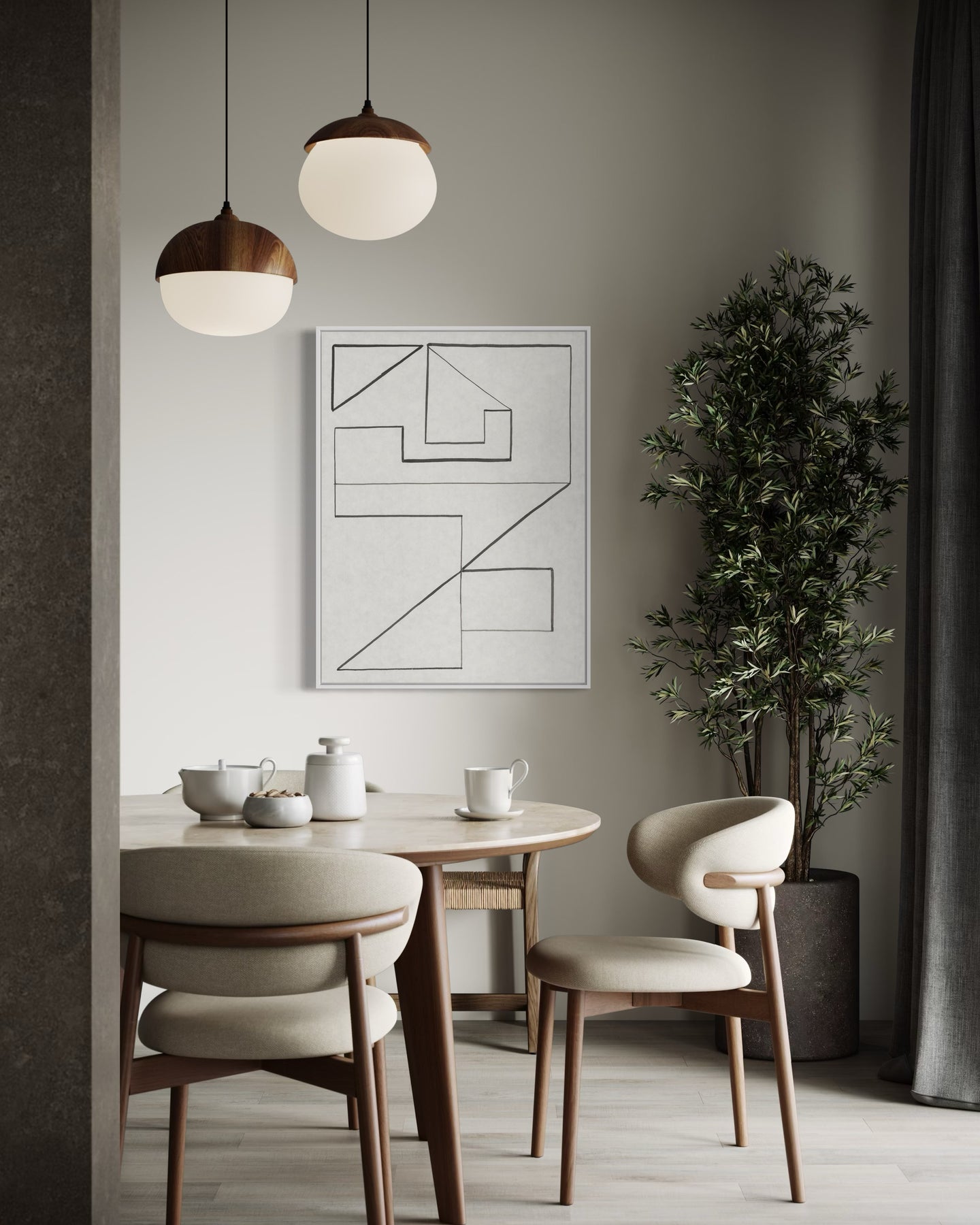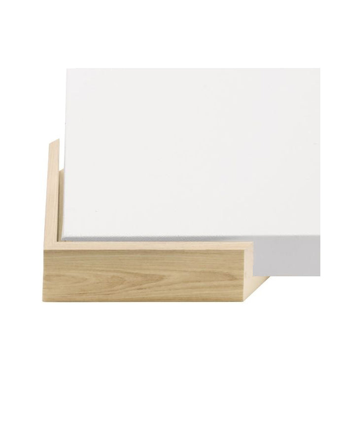 Light Oak color float frame: Finish in matte sheen. 3/8” thick frame, 2” deep. Float frame sits approx. 1/4” from the edge of the canvas.